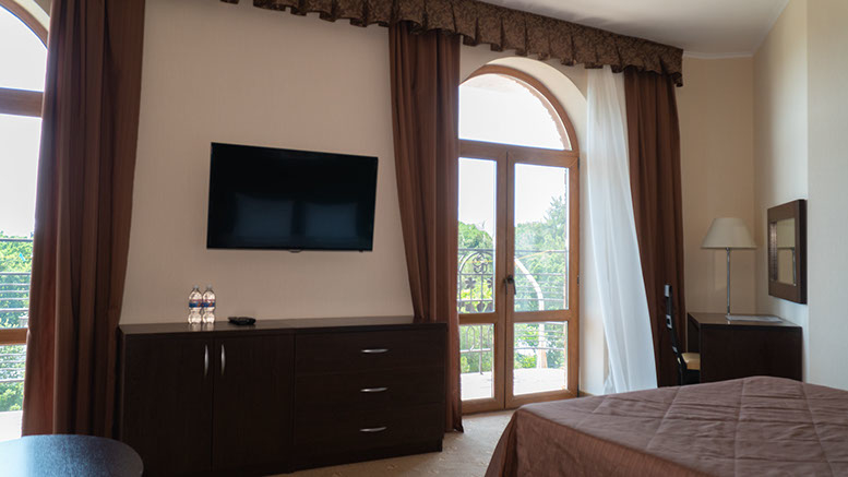 Это однокомнатный номер площадью 26 кв.м с совмещенный гостиной и спальной зоной, отдельным санузлом. В номере двуспальная кровать, 2 прикроватные тумбы, ЖК ТВ, комод, стол письменный с зеркалом, тумба под холодильник со встроенным мини-холодильником, микроволновая печь, чайник и чайный набор, диван-кровать, журнальный стол, шкаф для одежды, багажная тумба, прихожая с зеркалом. В номере есть кондиционер, большой балкон с видом на море. Количество спальных мест: 2 (и возможны +2 дополнительных места)
